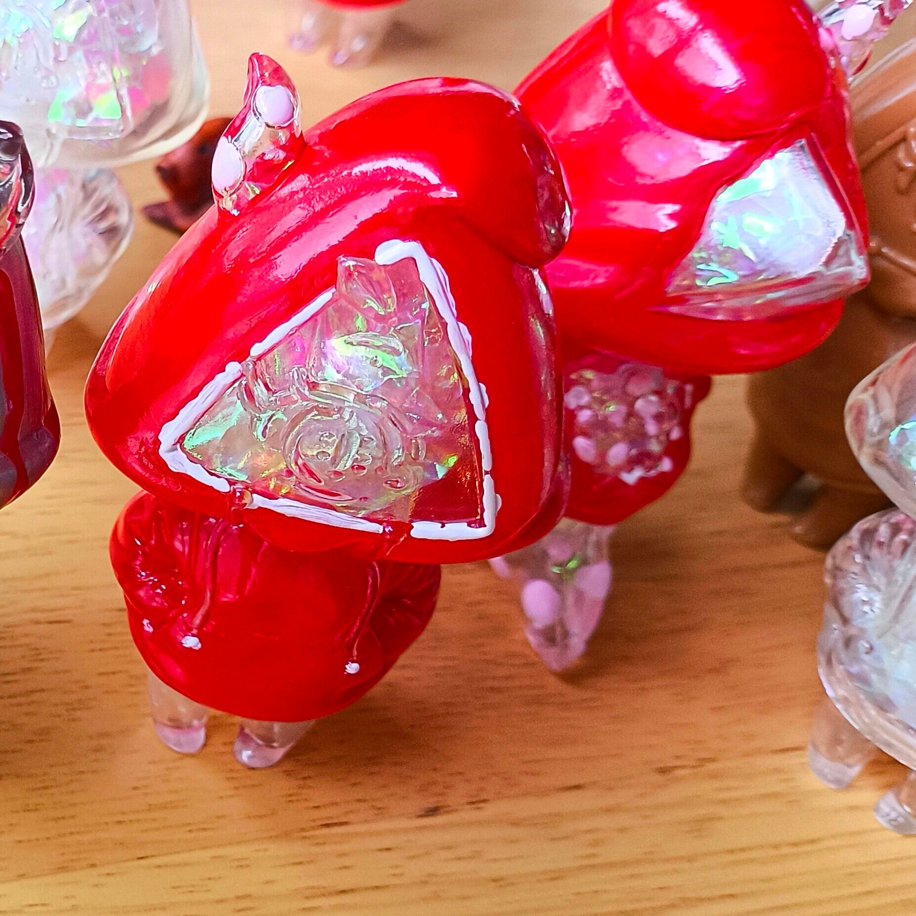こちら [ ハツネちゃん ] をお求め頂くと、画像 に写っているもののうち、「パーカー部分が赤く塗られていて、本体成型色が透明で、中にオパルス的なのが詰まっている」もののみがご自宅に伺います。白いのや全体が透明なの、茶色いエメネちゃんは一緒になりませんので、ご留意下さいませ、