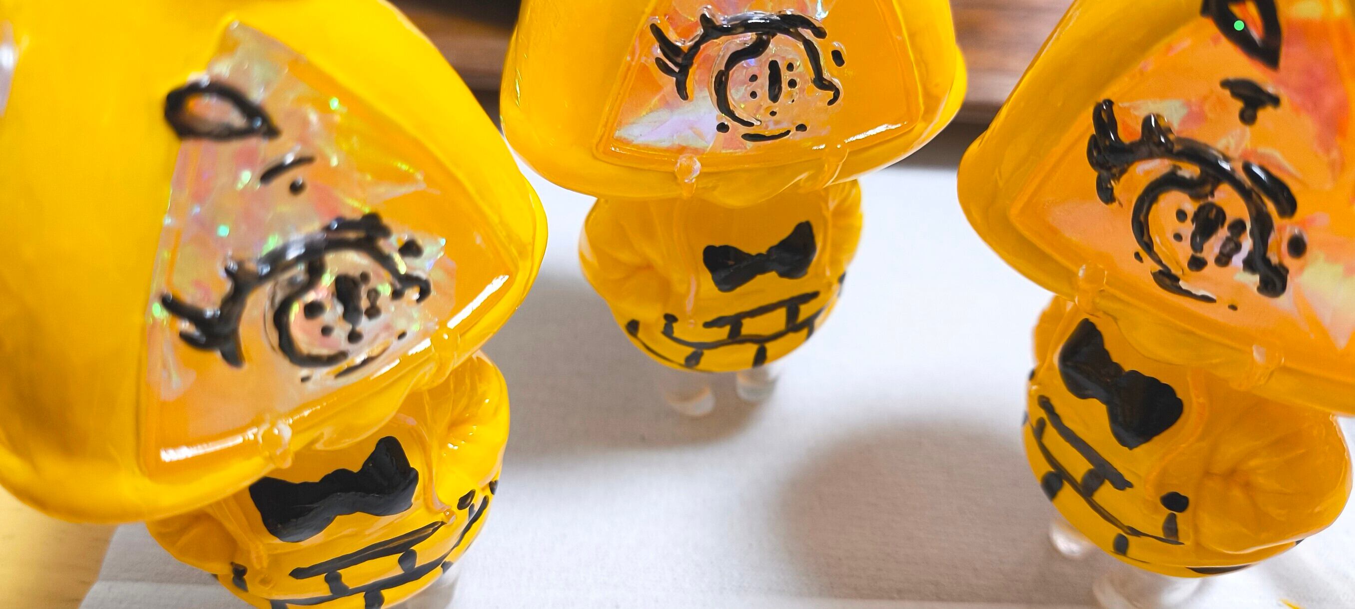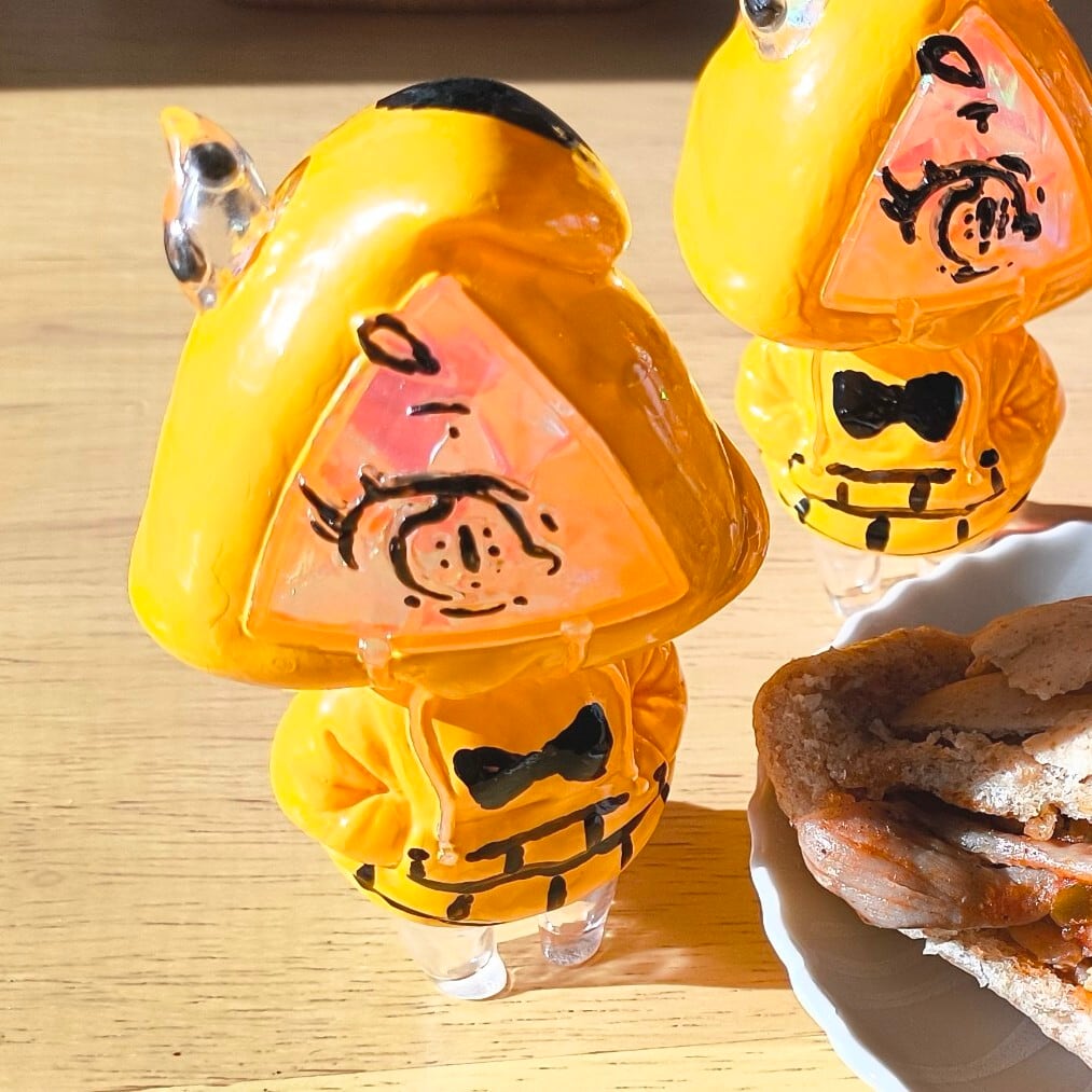 こちら [ シファネちゃん ] をお求め頂くと、画像 に写っているもののうち、「パーカー部分が黄色く塗られていて、本体成型色が透明で、中にオパルス的なのが詰まっている」もののみがご自宅に伺います。白いのや全体が透明なの、茶色いエメネちゃんは一緒になりませんので、ご留意下さいませ、